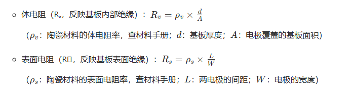 基板电阻分体电阻(体积绝缘电阻) 和表面电阻(表面泄漏电阻) ,均由陶瓷材料固有特性决定,需结合基板尺寸计算: