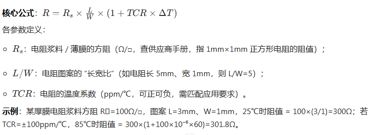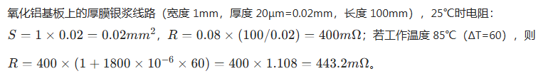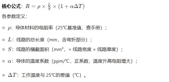 导体线路(铜箔、厚膜银浆、薄膜金层等)的电阻由材料电阻率、线路尺寸决定,公式基于欧姆定律推导: