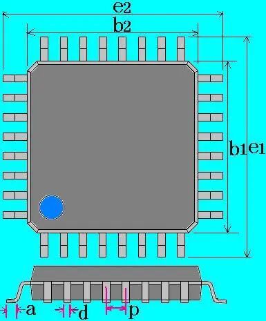 A=a+0.8,B=0.19mm P=p G1=e1-2*(0.4+a) G2=e2-2*(0.4+a) | 引脚长由原来的a+0.70mm更改为a+0.80mm,有利于修理和印刷拉尖的处理。对于高度为3.8mm的LQFP焊盘设计宽度采用0.23mm(钢网开口宽度0.19mm) | |||