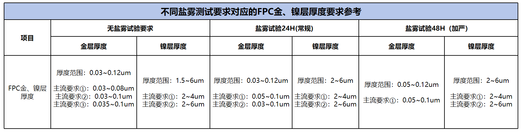 不同盐雾要求对应FPC金、镍层厚度要求参考图示