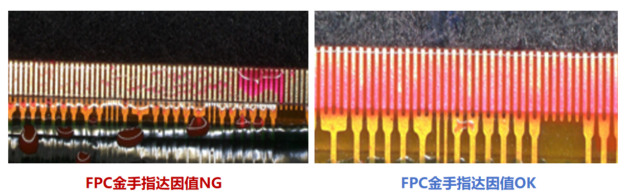 除了宽度、厚度,FPC绑定金手指表面的达因值,也是容易被忽视但至关重要的管控指标——若达因值不达标,FOG绑定后易出现三大不良:FPC拉拔力不达标、导电金球压痕偏浅、信赖性测试后易失效(附FPC绑定金手指达因值OK/NG对比图示,便于直观区分达标与不达标状态)。