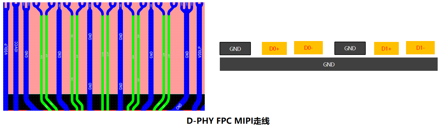 上述阻抗管控标准,需在FPC设计图纸中明确标识,确保厂商按要求制作,从设计源头避免因阻抗不匹配导致的显示异常。(附D-PHY FPC MIPI走线图示:图示清晰标注了D-PHY接口的差分走线布局,包含两条对称的差分信号线(DP/DM),走线过程中严格保持线宽一致、间距均匀,避免出现弯折、交叉或线宽突变等影响阻抗稳定性的情况;同时标注了参考地平面的位置,以此确保差分阻抗稳定在100±10%Ω范围内,直观呈现了MIPI走线的规范设计要求,便于设计、审核及生产环节对照参考。)