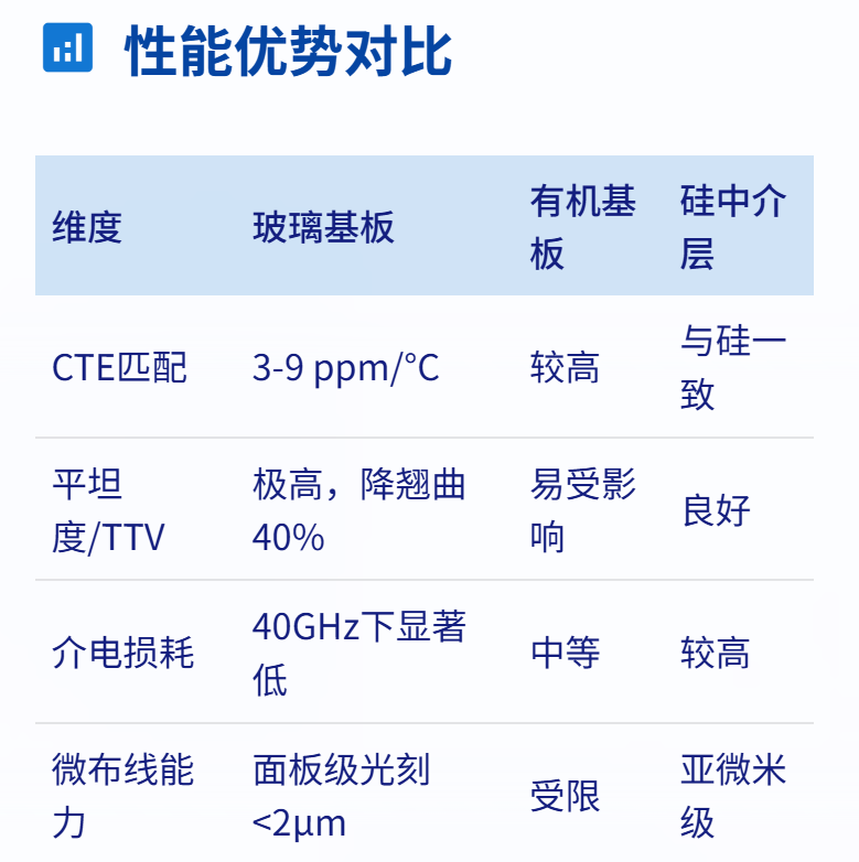 玻璃基板价值: 不仅可作为透明衬底直接集成光路,其低损耗特性更是高效光子传输的关键,有力支撑了共封装光学等前沿技术。