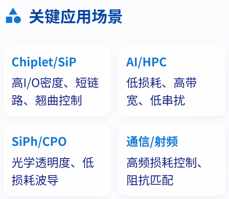 玻璃基板价值: 极高的平坦度和稳定性支持更细的布线,实现高密度互连;优良的介电特性保障了高速信号的完整性,是HBM和计算芯粒的理想互联载体。