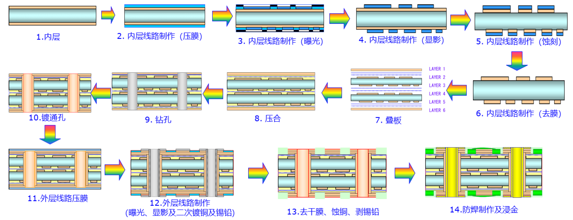 传统PCB板加工流程复杂,成熟度高。以多层板为例,说明传统PCB加工常规流程,如下图所示。