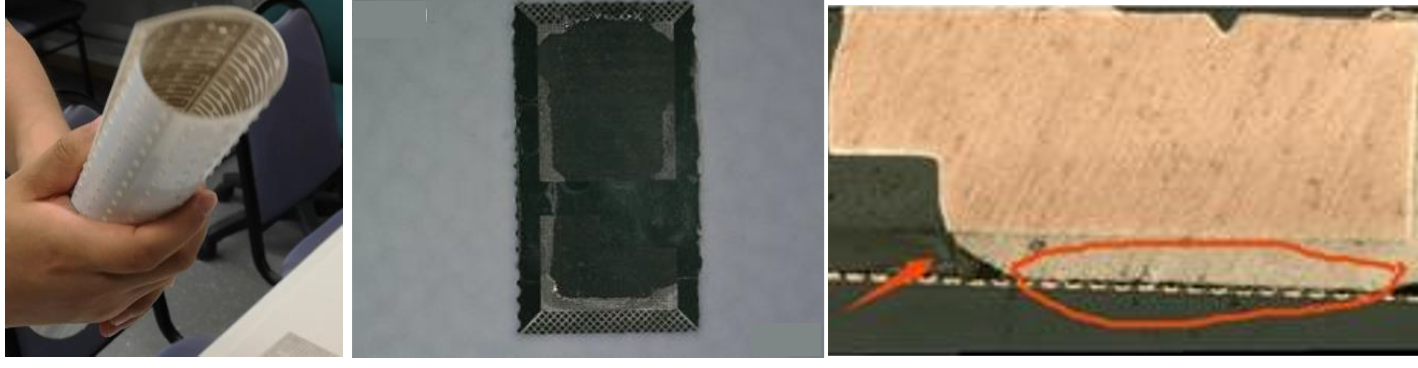 可靠性问题:软性灯板卷曲时, LED和线路层易发生断裂;推拉力后LED脱落,焊盘和线路层均从基板上脱落。