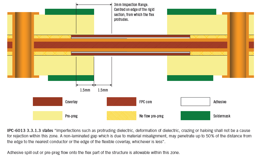 根据 IPC-6013 标准,该过渡区被明确定义为以硬板边缘轴线为中心、总宽典型值为 3mm 的区域。此区域是机械应力与热应力的集中地带,风险贯穿制造、组装乃至产品整个生命周期。不当的设计将直接导致开裂、分层或功能失效。本文将深入探讨这一关键区域的设计要点和制造注意事项,帮助您避免潜在风险。