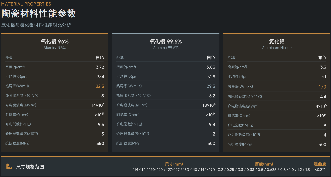 陶瓷基板材料的选型核心围绕热导率、热膨胀系数、机械强度与成本四大维度,不同材料形成明确的市场分层,具体特性及应用场景如下: