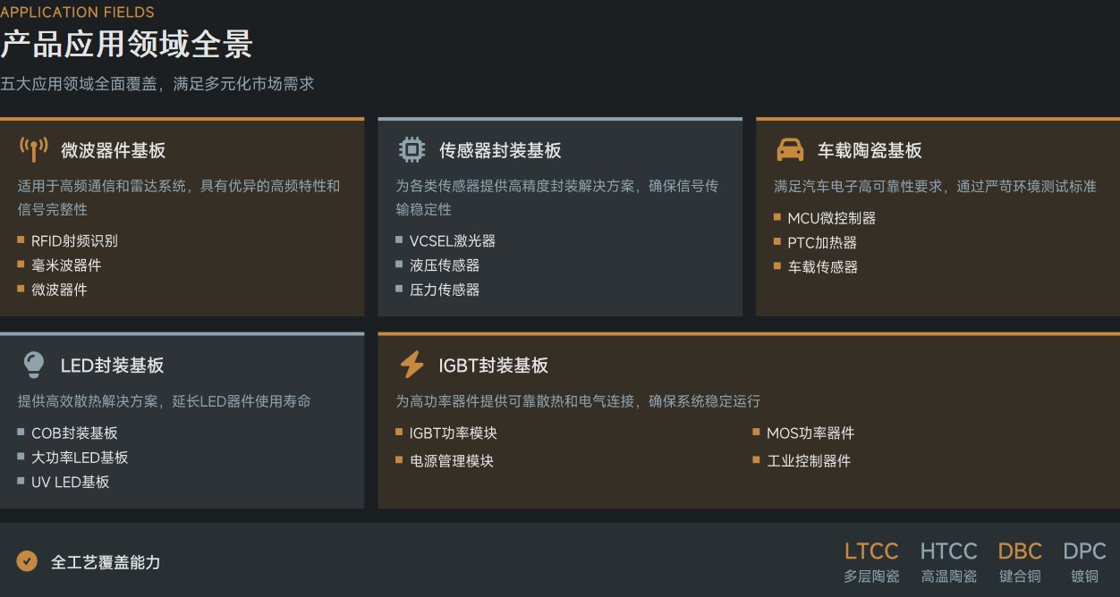 SiC、GaN等第三代半导体器件的高温、高压、高频特性,对陶瓷基板提出定制化需求,核心适配场景与技术要求如下: