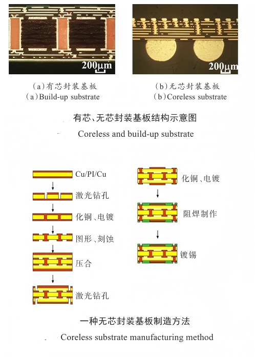 有芯基板主要由中间芯板及上下两侧积层板组成,无芯基板则是去除芯板结构的封装基板,仅由积层板堆叠形成。图2为有芯基板与无芯基板的结构示意图,图3为某类无芯封装基板的制造流程示意图——该方法以双面铜箔聚酰亚胺(PI)为基材,以PI膜作为绝缘层,通过加成法实现高密度布线。