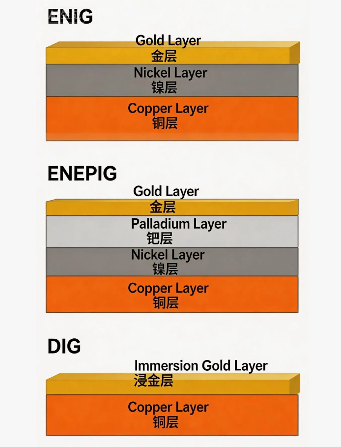 铜 → 化学镍 → 钯层 0.05~0.1μm → 金层。