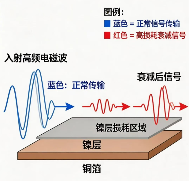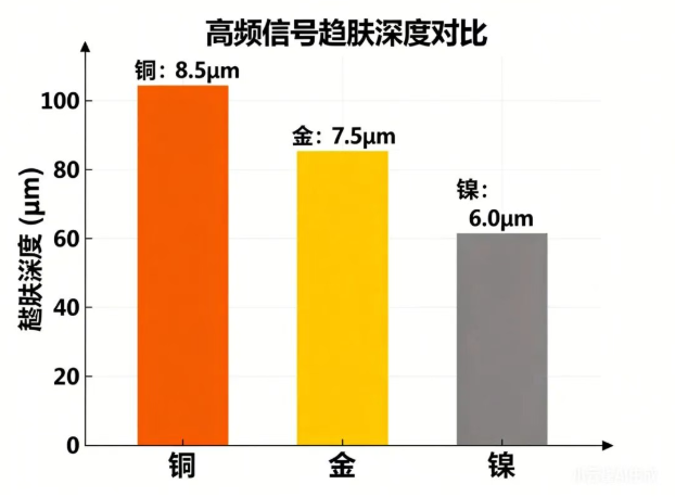 高频信号因趋肤效应,会穿透薄金进入镍层,造成:
