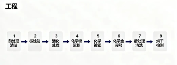 铜 → 电镀镍 5~8μm → 电镀金 0.1~3μm。