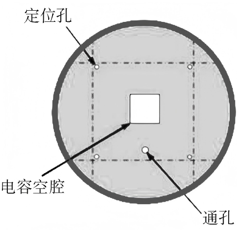 打孔是LTCC工艺的起始环节,也是保障后续层间对准和互连可靠性的关键。首先将制备好的生瓷带切割为规格统一的正方形,随后通过高精度冲孔机,精准制备三类关键孔位(见图:生瓷片打孔定位图):对准孔、通孔和电容空腔。其中,对准孔用于后续多层生瓷带的精准层压对齐,避免层间偏移影响器件性能;通孔用于搭建陶瓷流延层之间的金属连接通道,实现层间电感、电容的电信号互通;电容空腔则为后续电容器的形成提供空间基础,直接影响传感器的电容初始值和灵敏度。