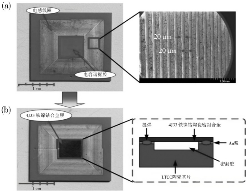 密封工序完成后(如图b所示),通过陶瓷基板上集成的LC串联谐振电路,即可完成陶瓷电容式压力传感器的全部制备。当外部压力施加到敏感膜上时,金属膜片会根据压力大小发生相应弯曲,进而改变电容器电极板之间的距离,导致电容值发生变化,通过LC谐振电路将电容变化转化为可测量的电信号,最终实现压力参数的精准检测。