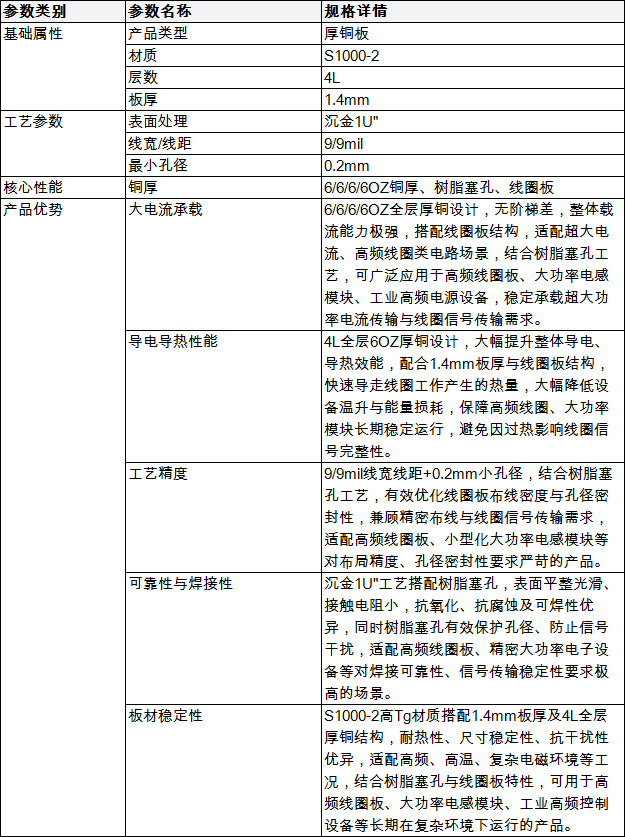4L 6/6/6/6OZ厚铜板(S1000-2+沉金1U" 树脂塞孔线圈板)产品规格表