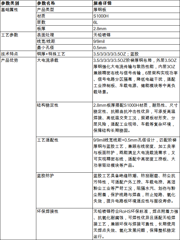 6L 阶梯厚铜板(S1000H+无铅喷锡+蓝胶)产品规格表