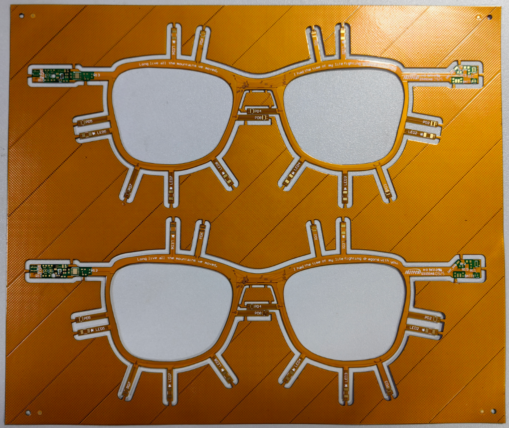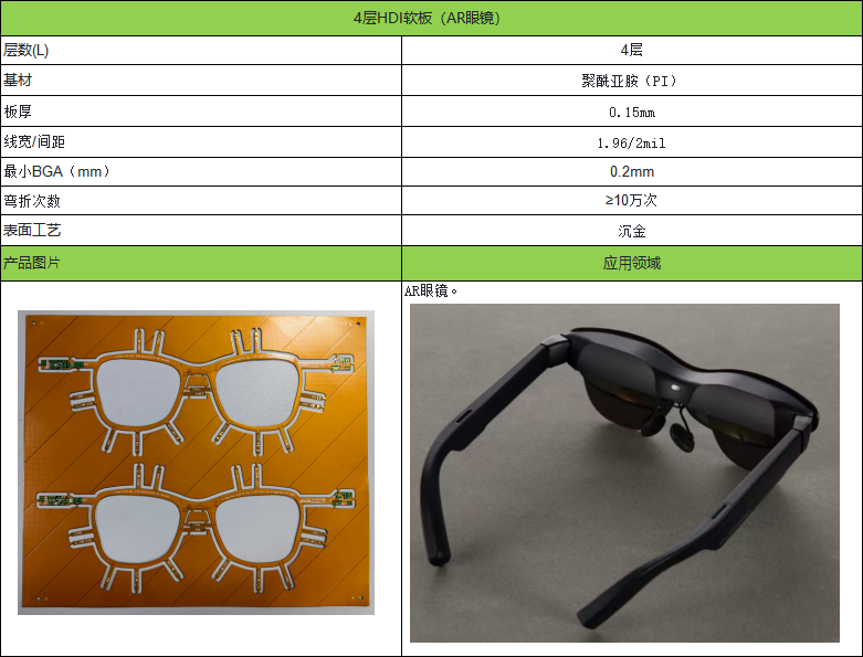 该 4 层 HDI 软板专为 AR 眼镜定制,主要承担镜腿、镜框内的主控、传感器、显示模组之间的电气互联,解决了 AR 设备对 “轻薄、高集成、耐弯折、信号稳定” 的多重核心需求,是实现 AR 眼镜小型化、轻量化的关键硬件支撑。